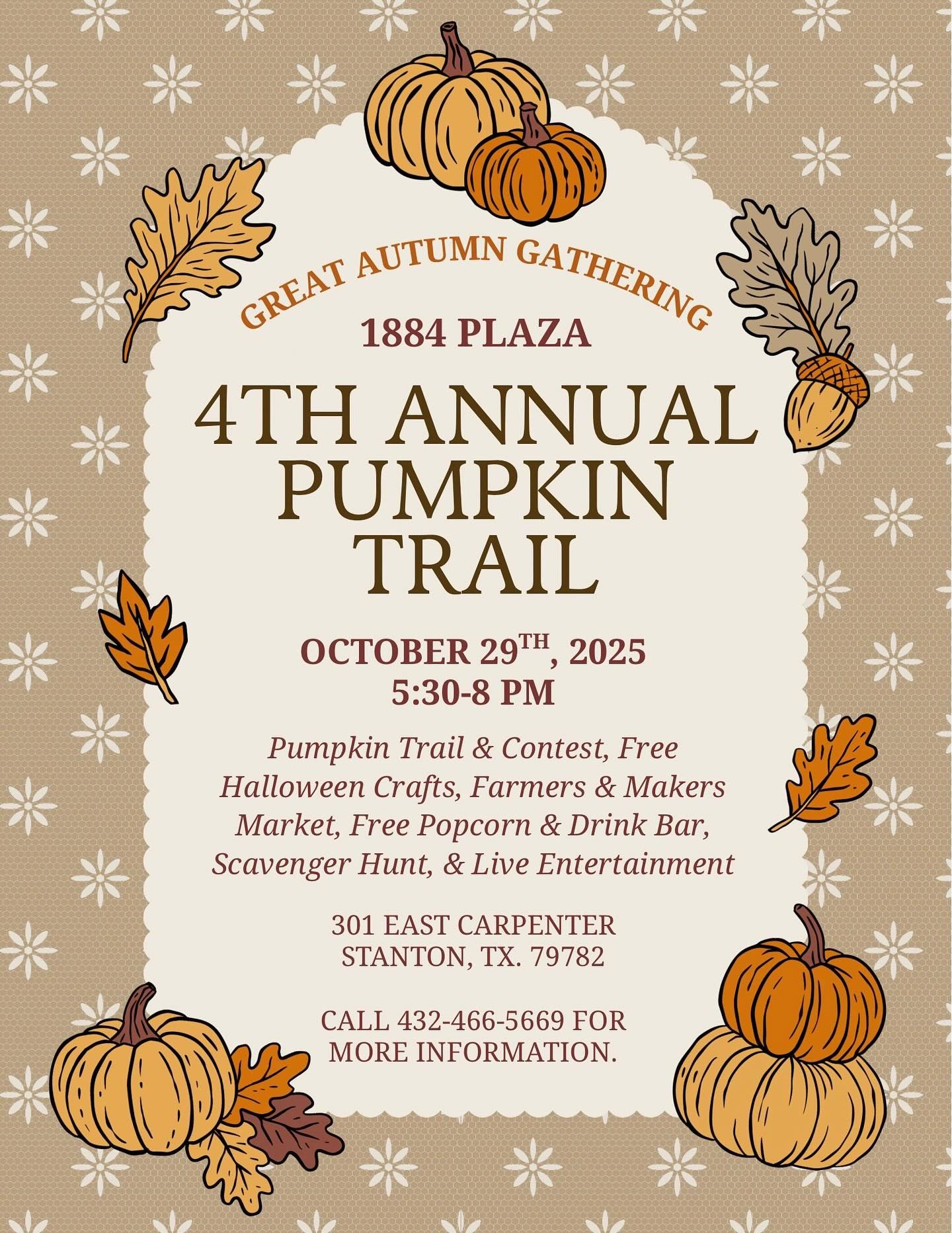 Come join us for the 4th Annual Pumpkin Trail, Wednesday, October 29, 2025, from 5:30 PM to 8:00 PM. There will be a farmers and makers market, pumpkin decorating, free kid crafts, free popcorn bar, free S'mores bar, live entertainment, and so much more!
